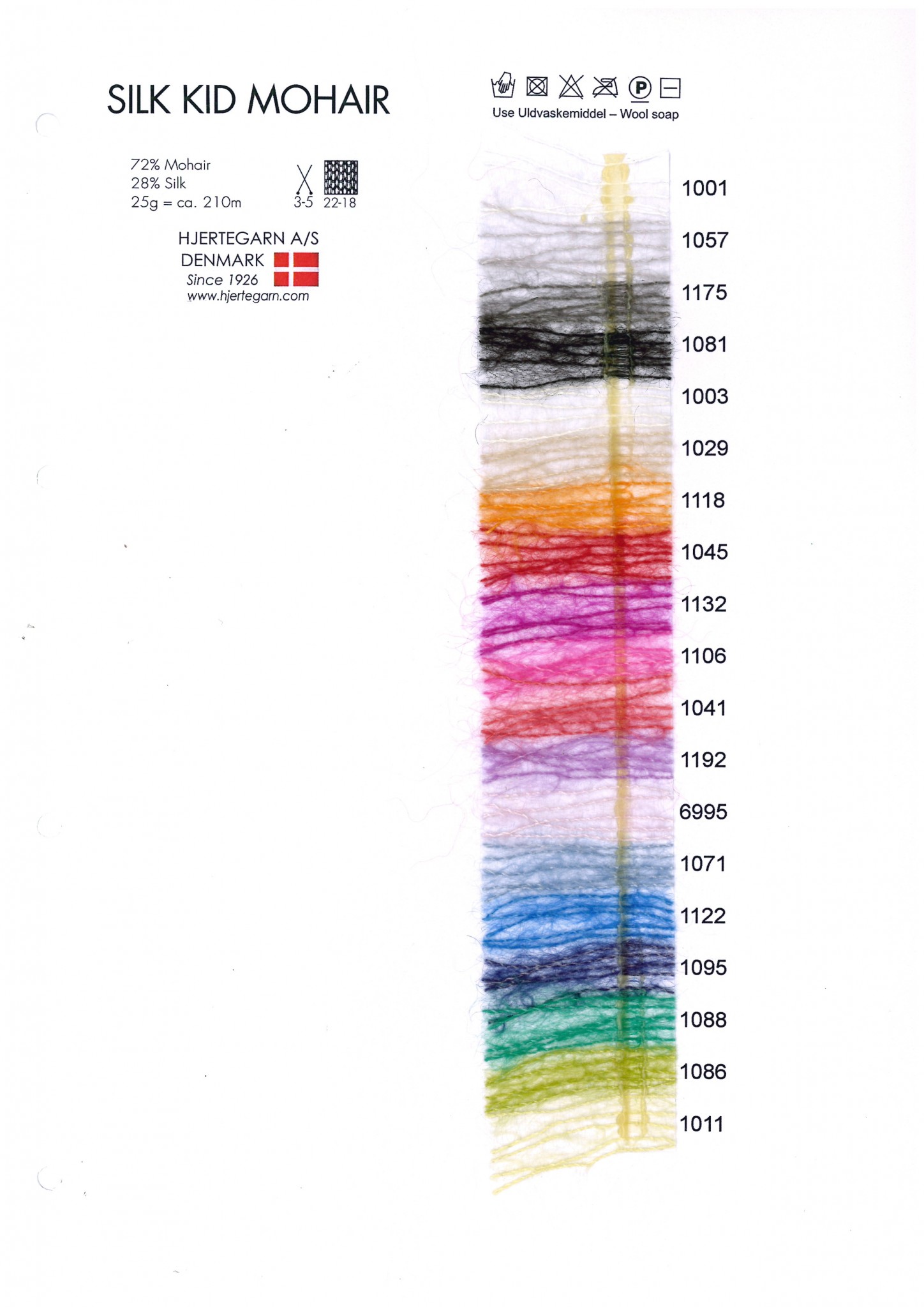 Silk Kid Mohair är ett tunt och mjukt mohairgarn från Hjertegarn. Material: 72% kidmohair och 28% silke Mängd per nystan: 25 gr = 210 m Stickor 3-5 mm Stickfasthet: 20 maskor slätstickning på stickor 4 = 10 cm