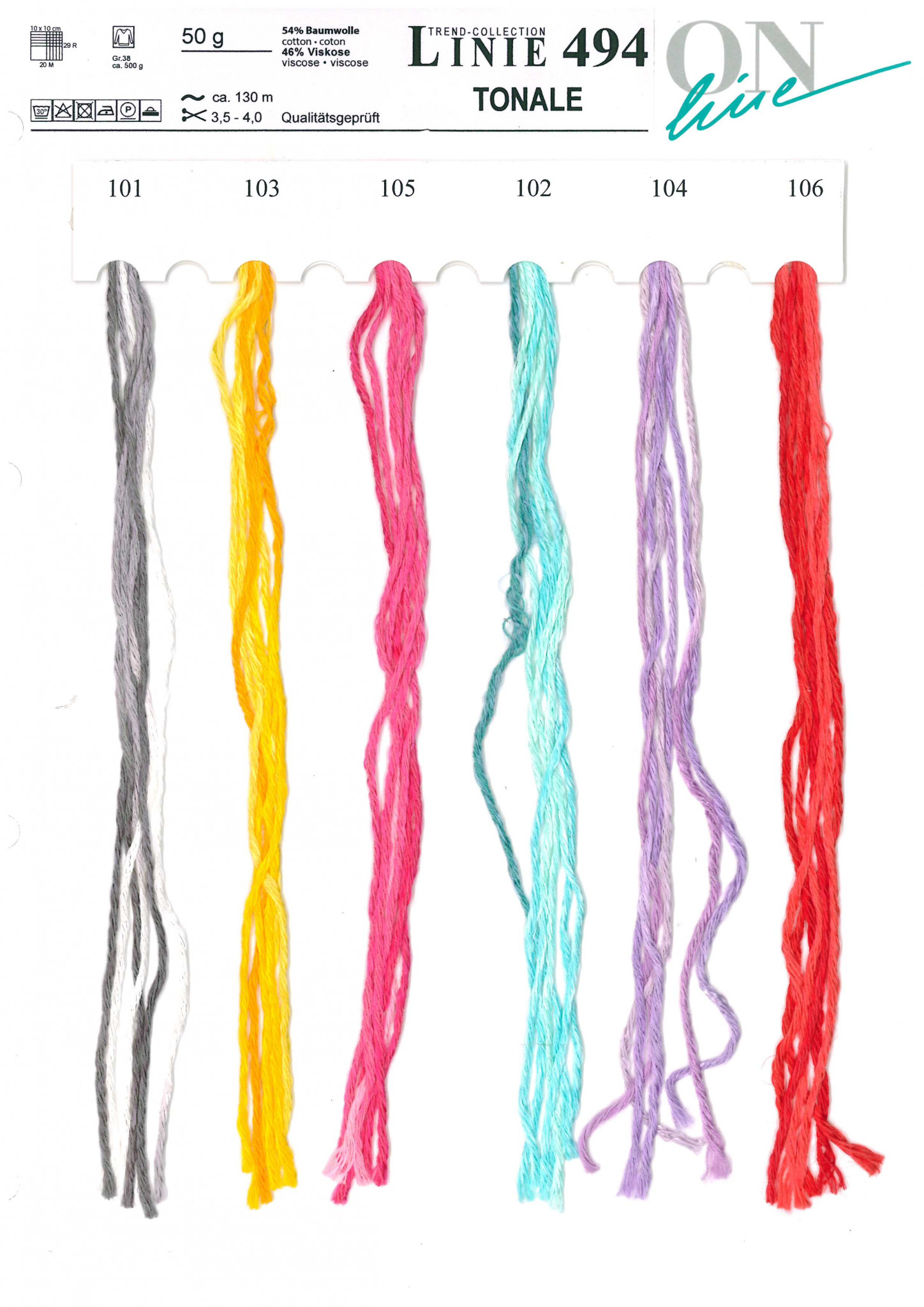 Linie 494 Tonale är ett blandgarn innehållande bomull och viskos. Kombinationen av de två fibrerna ger garnet en luftig och smidig karaktär. Ton i ton infärgningen ger garnet en mjuk färgkombination.